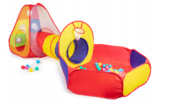 Ігровий намет дозволяє грати багато годин. У набір входять 100 різнокольорових кульок, які можна кинути в 5 різнокольорових мішеней на бічній стіні. Намет з'єднаний тунелем з басейном, де можна потренуватися в кидках у кошик.